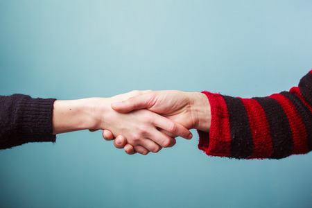 Two hands engaged in a handshake, symbolizing agreement, partnership, or cooperation in a professional or personal context.