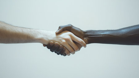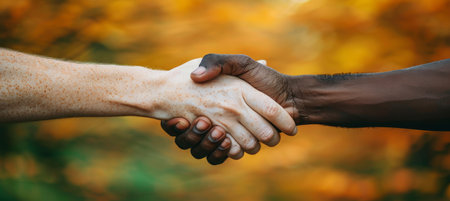 A close-up of hands from different ethnic backgrounds shaking, symbolizing unity, cooperation, and respect in a diverse society. Perfect for themes of collaboration and inclusivity.