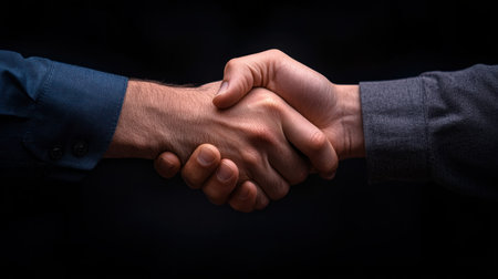 Handshake on black background Show your professionalism and trustworthiness with this powerful photo of two hands clasping in a handshake on a black background.