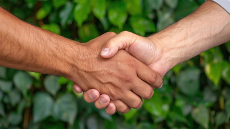 This image captures the essence of collaboration with a close-up view of two hands shaking. The green leafy background adds a fresh touch, symbolizing growth and partnership in professional relationships.