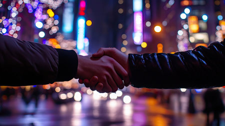 A close-up of two hands shaking in a vibrant city setting, illuminated by colorful lights. This image symbolizes partnership, agreement, and collaboration during a lively urban night.