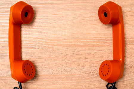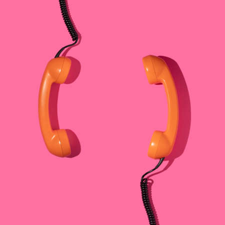 Creative layout with couple old phone handsets on bright orange background. Retro fashion style. Minimal aesthetic communication concept. Spring or summer idea.