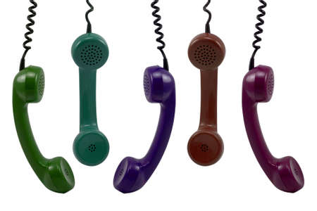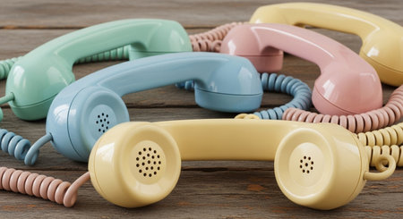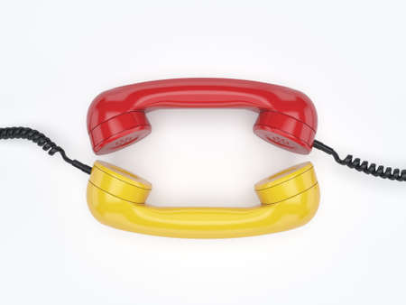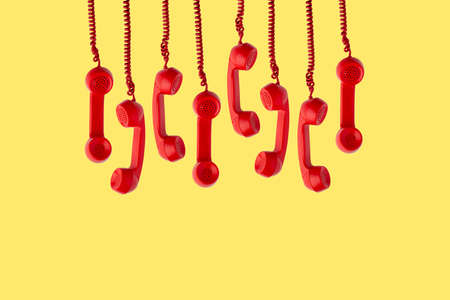 3d rendering of three colorful retro telephone receivers hanging on yellow background