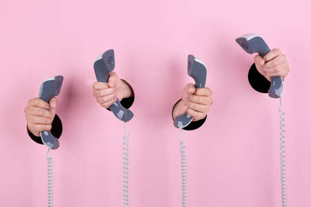 Three office phone tubes wrapped in cable on pink studio background. Call center, hotline concept