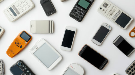 Evolution of devices from pager to smartphone laid on white surface with copy space