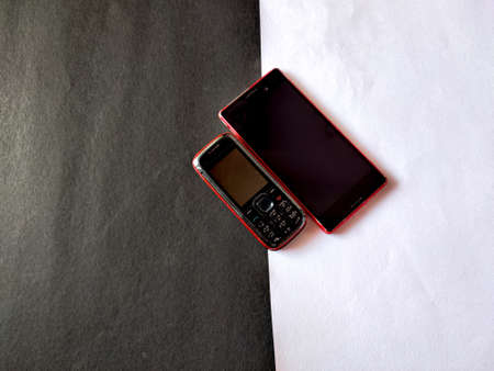 One Keypad mobile and one smart phone in different sizes isolated on white and black background. Selective focus