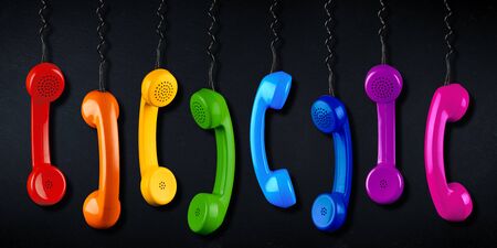 row of colorful rainbow colored old fashioned retro phone reciever with black telephone wire on black slate blackboard background, business communication support service concept