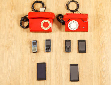 set of various old phones and modern smartphones on yellow wooden background. conceptual photo