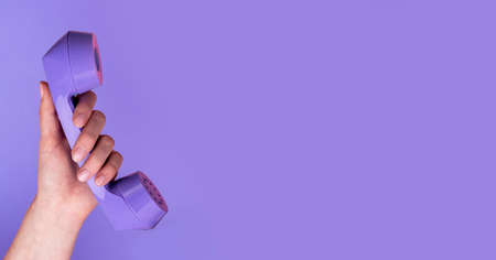 Hand with retro phone receiver picked up. Modern minimalistic monochrome purple banner with copy space. High quality photo