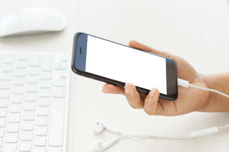close-up hand holding phone mobile showing white screen on desk