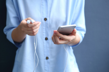 Woman holding earphone with using smartphone for listen song
