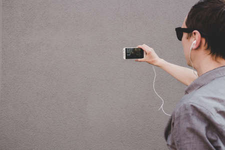 Young smiling hipster man taking selfie with his smartphone. Gray background, copy space