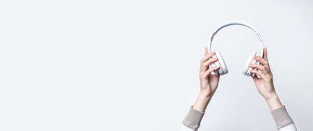 Female hands holding large white headphones on a light background. Banner