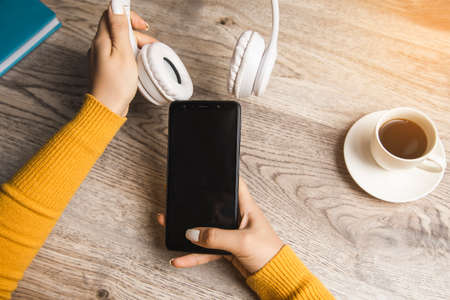 Modern unrecognizable mobile phone - touchphone with connected headphones on white wooden table