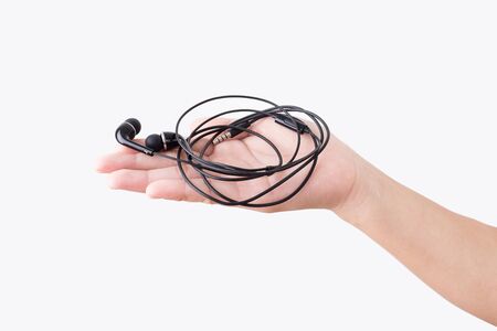 A woman hand holding earphones on white background