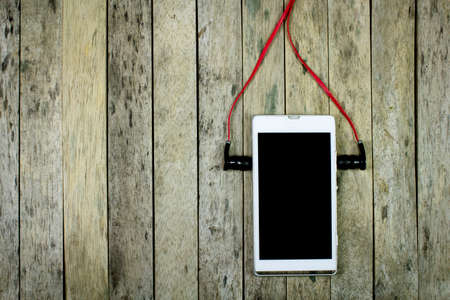 Mobile phone on a white background. White headphones on the phone. Close-up.