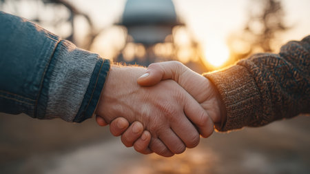 Two hands engage in a warm handshake against a serene sunset backdrop, symbolizing partnership and trust. This image captures the essence of cooperation and connection in a beautiful outdoor setting.