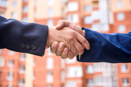 Customers celebrate successful real estate deal with a handshake after finalizing home insurance investment loan agreement. Concept Real estate, Loan agreement, Home insurance, Handshake, Celebration