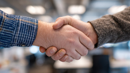 Close-up of two hands shaking, one in a plaid jacket, symbolizing agreement, trust, and mutual respect in a warm business setting.