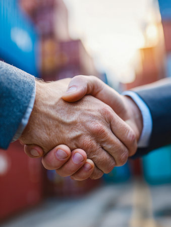 Two professionals seal a deal with a firm handshake amid a vibrant city backdrop, capturing the essence of trust and strategic alliances in urban environments.