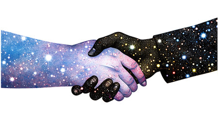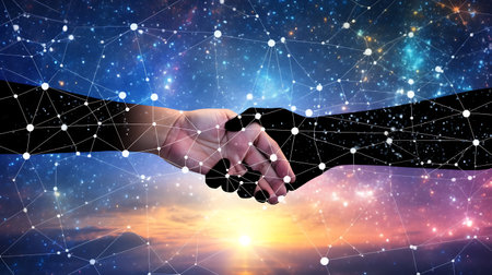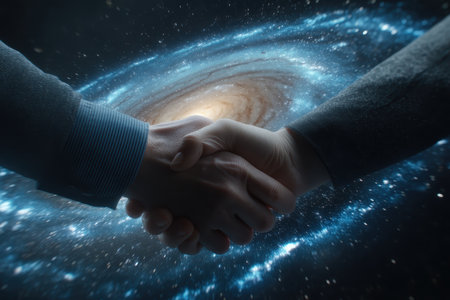 A stunning representation of two hands shaking against the backdrop of a galaxy, symbolizing connection, partnership, and collaboration in a vast universe, suggesting endless possibilities.