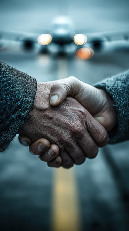 A close-up of two hands shaking in agreement, symbolizing partnership, with an airplane in the background, suggesting business travel and professional collaboration.