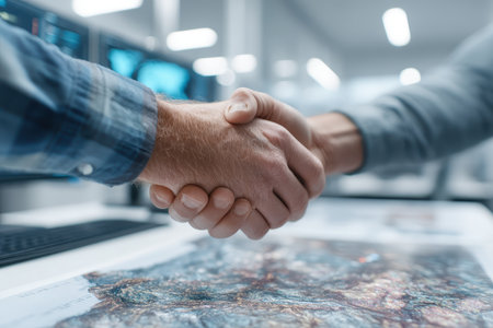 Close-up view of two professionals shaking hands over a detailed map in a modern office, symbolizing partnership and collaboration in a business environment.