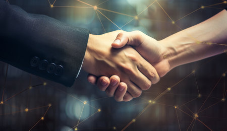 double exposure image, a handshake between two business partners seamlessly merges with a network of interconnected lines. The simplicity and sophistication of corporate collaboration.