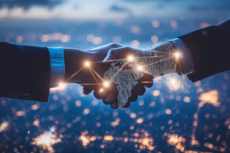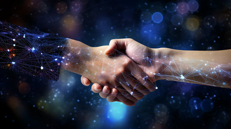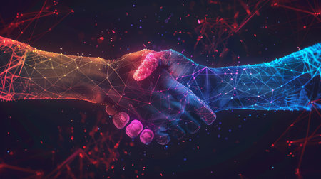 The digital handshake symbolizes future collaboration and technological partnership in a modern and innovative way