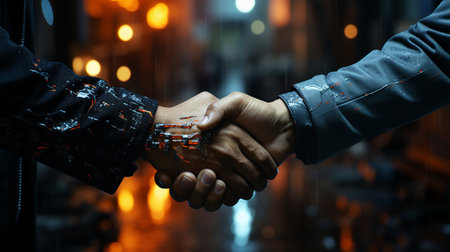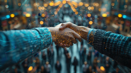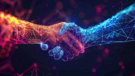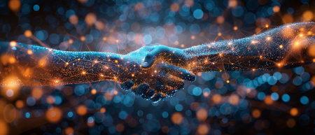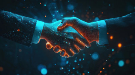 Futuristic digital handshake symbolizing partnership and collaboration in a technology driven world