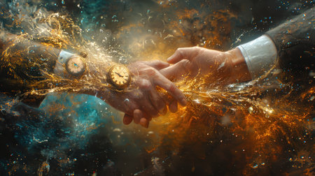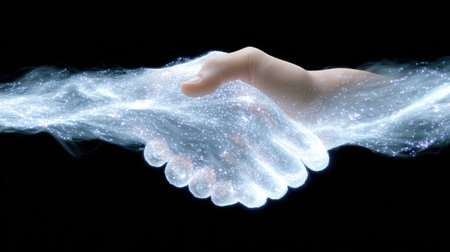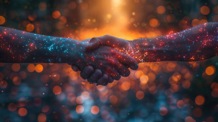 A captivating ethereal handshake symbolizes unity and connection, featuring a glowing cosmic effect against a dark backdrop. Perfect for themes of collaboration and trust.