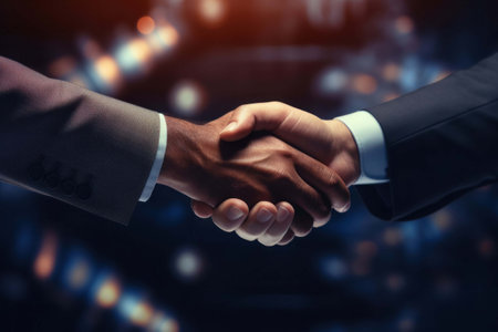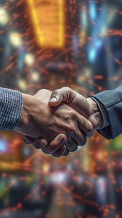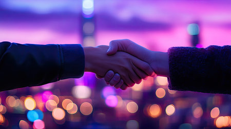 A stunning close-up of a handshake set against a vibrant cityscape at dusk. This image captures the essence of collaboration, trust, and connection amidst a backdrop of colorful city lights and a warm atmosphere.
