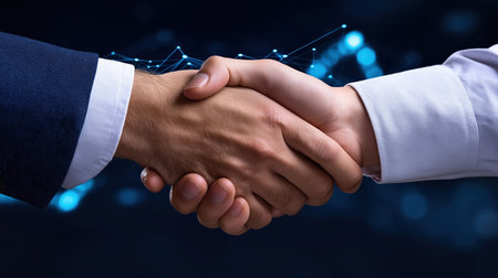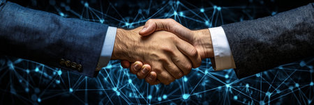 Two individuals engage in a firm handshake, representing a new business agreement or collaboration. The background features a modern digital design, emphasizing a professional atmosphere.
