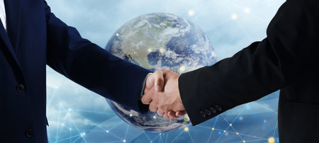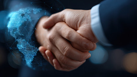 Two individuals engage in a handshake, symbolizing agreement and collaboration. A digital world map overlay adds context of global business. The image showcases close-up view with muted colors, implying a professional atmosphere. Suitable for illustrating partnerships or international business.