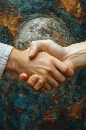 Two hands meet in a firm handshake representing collaboration and mutual understanding. The backdrop features a colorful abstract design, enhancing the sense of connection.