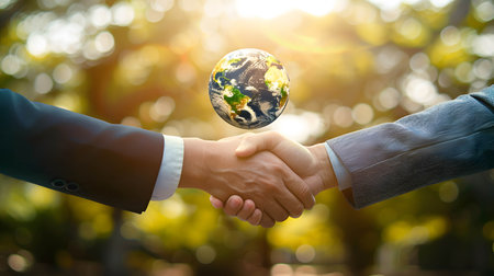 A handshake between two individuals, doing business that places importance on environmental conservation and taking care of the world