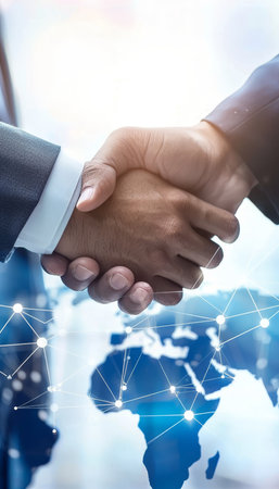 Handshake between diverse individuals against a world map backdrop, symbolizing international business.