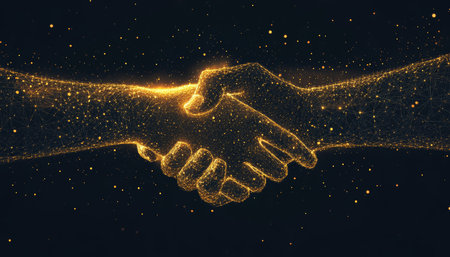 Low poly business handshake illustration with golden stardust effect on dark background