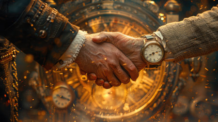 A diverse pair of partners engaging in a handshake showcasing their formal attire. One hand is adorned with a stylish watch while the other sports a sleek bracelet highlighting th