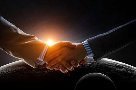 Handshake of two people on a background of stars and nebula
