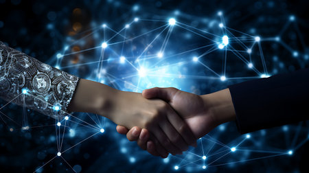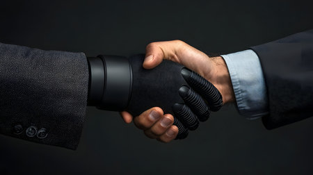 A robotic hand shakes hands with a human hand, showcasing a fusion of technology and humanity. The dark background enhances the focus and emotion of this partnership moment.