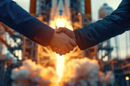 Close-up Two engineers handshake in front of a spaceship launch