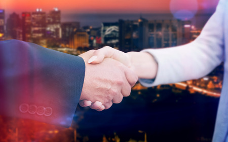 double exposure of business partner shaking hands, close up handshake businessman and businesswoman agreement deal, teamwork and partnership concept investment dealing with night cityscape background.