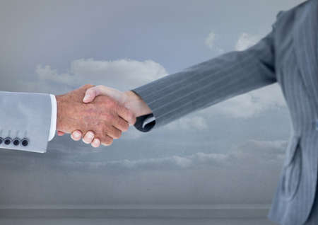 Mid section of businessman and businesswoman shaking hands against clouds in the sky. global business and partnership concept