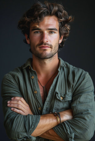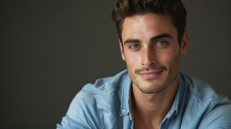 Attractive man with a gentle smile, looking at the camera. Plenty of copy space on the left side.