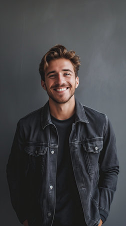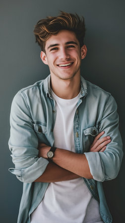 A confident young man in a casual denim jacket smiles warmly while crossing his arms against a neutral gray background. This image conveys warmth and approachability, perfect for lifestyle themes.