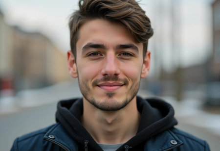 A young Belarusian man stands confidently on a peaceful street, sporting a casual jacket and an inviting smile.