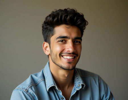 A young Egyptian man with dark curly hair beams with a friendly smile while wearing a casual denim shirt. His relaxed demeanor creates an inviting atmosphere against neutral background Generative AI.