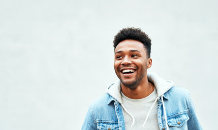 Happy young man in denim jacket and gray hoodie, smiles brightly against a soft gray background, showcasing a relaxed and cheerful atmosphere, AI generated