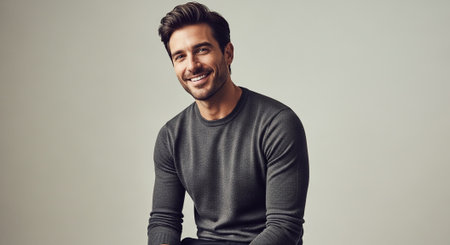 A young man beams with happiness, dressed in a smart jacket and posing against a neutral backdrop. His friendly expression radiates warmth and confidence.